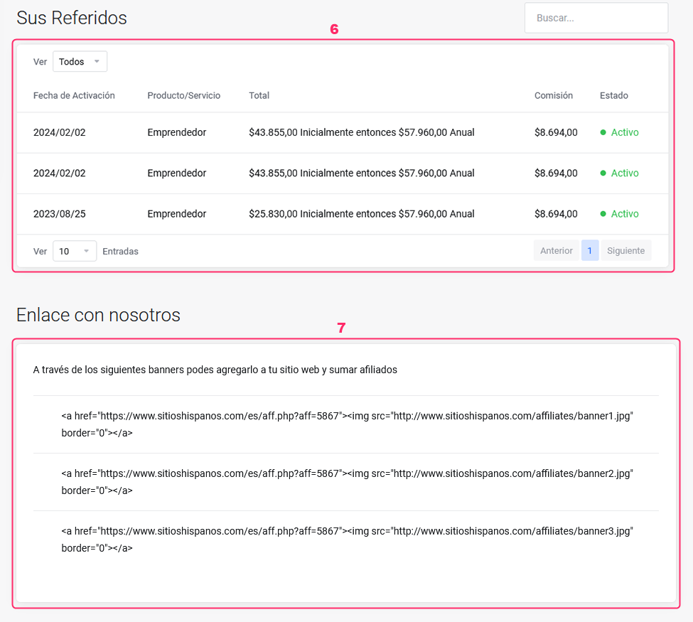 Enlace de referidos: Copiá este enlace y compartilo con cualquier potencial cliente que conozcas. Si el usuario se registra mediante ese enlace, se sumará como tu afiliado o referido. Ganarás una comisión por cada servicio que adquiera este nuevo cliente.