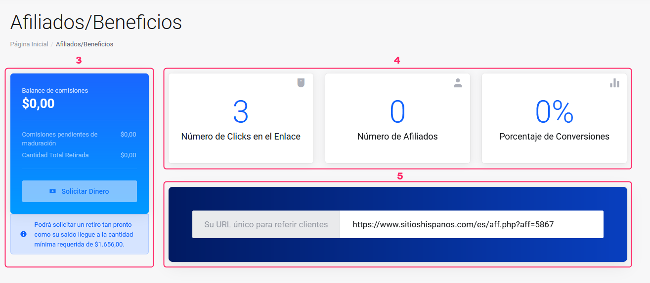 Información sobre comisiones: Podrás ver tus comisiones acumuladas, el balance, la cantidad de dinero retirado, etc. El botón "Solicitar Dinero" te permitirá retirar el dinero acumulado con tus comisiones. Tené en cuenta que debés alcanzar un saldo mínimo para poder retirar ese dinero. Este saldo se mostrará justo debajo del botón para solicitar dinero.