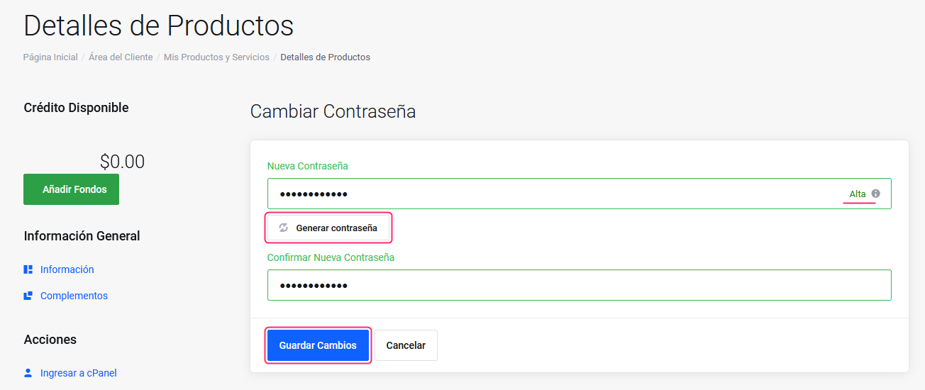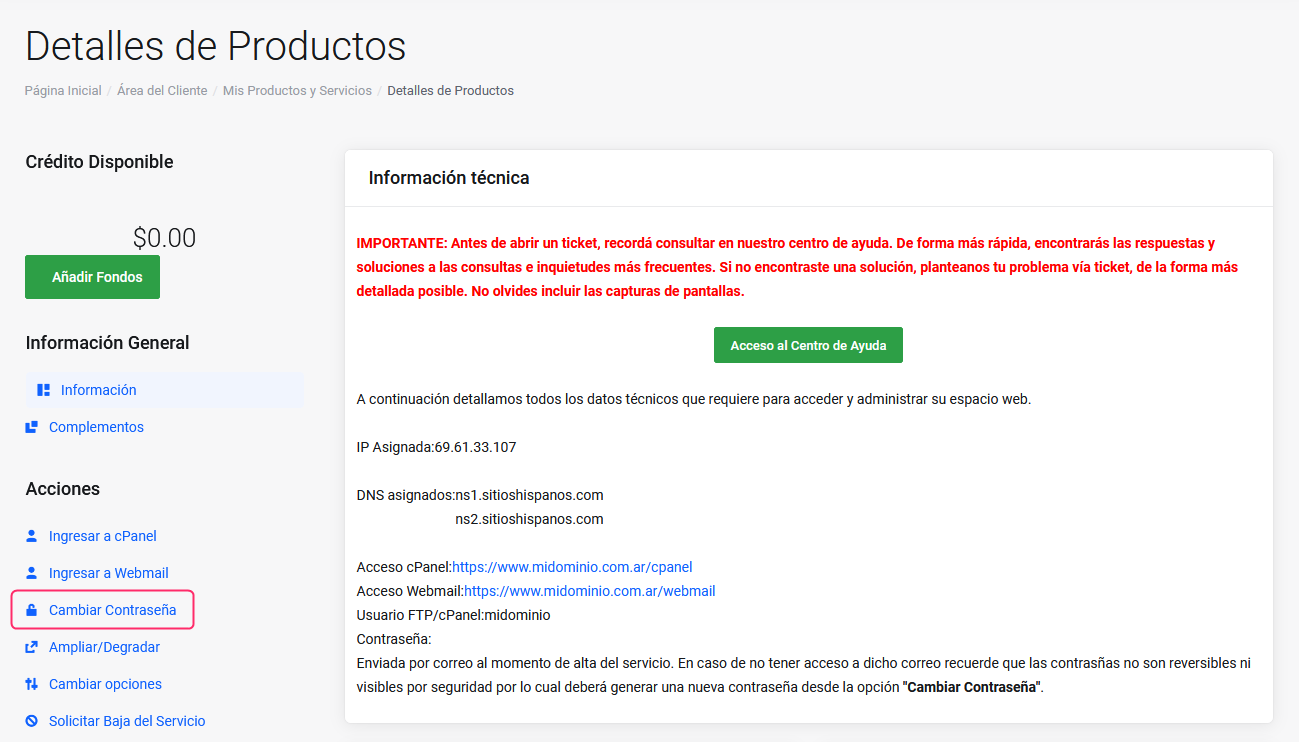 4. Seleccioná la opción **Cambiar Contraseña** que verás en la sección **Acciones** del menú de la izquierda, en la pantalla de **Detalles de Productos**.
