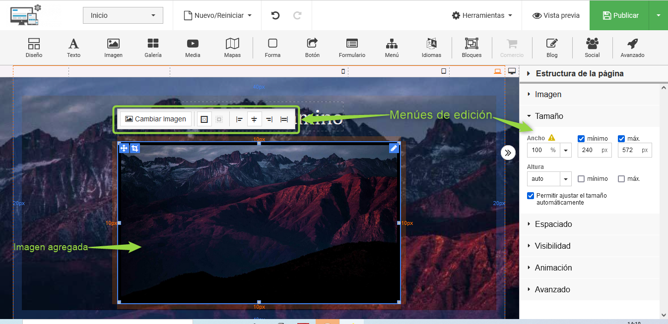 Otro aspecto importante es el agregado de elementos. Esto se hace de una manera muy intuitiva. Simplemente, seleccioná con el cursor cualquier elemento de la barra superior y arrastrá hacia el lugar en donde quieras colocarlo. Por ejemplo, vamos a agregar una imagen nueva:
