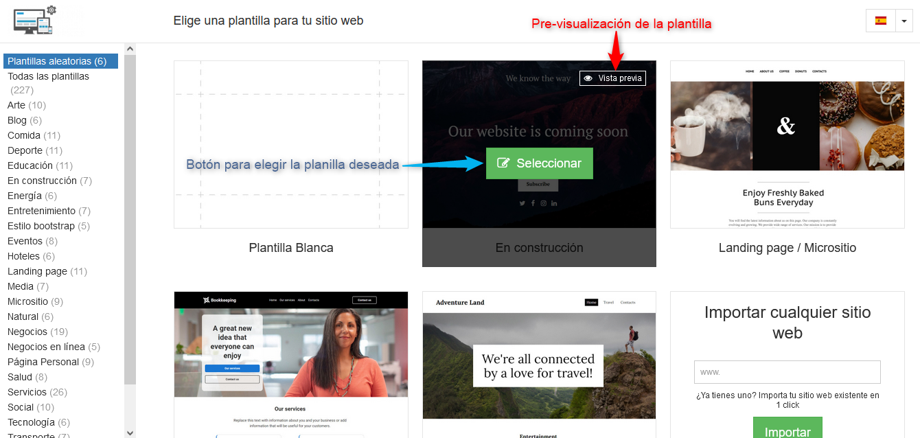 1. Elegí la plantilla que vas a utilizar para tu web. De ser necesario, podrás cambiarla más adelante. Apoyando el cursor sobre la plantilla deseada podrás previsualizarla o seleccionarla.