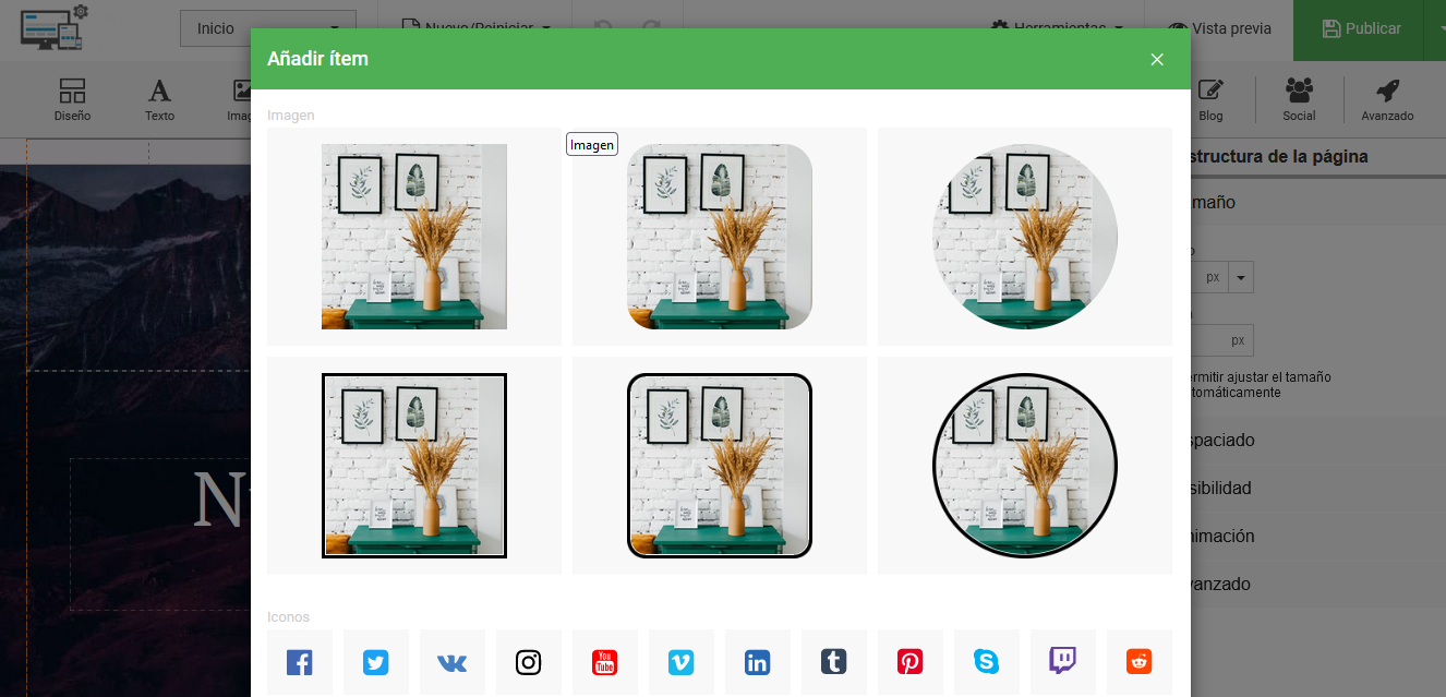 4. Podrás elegir entre subir una imagen de nuestro ordenador, de una URL, o utilizar una de las predeterminadas por la plataforma. Luego hacé clic sobre la imagen deseada, agregala, y al finalizar podrás re dimensionar, ubicar y modificar propiedades de la misma.