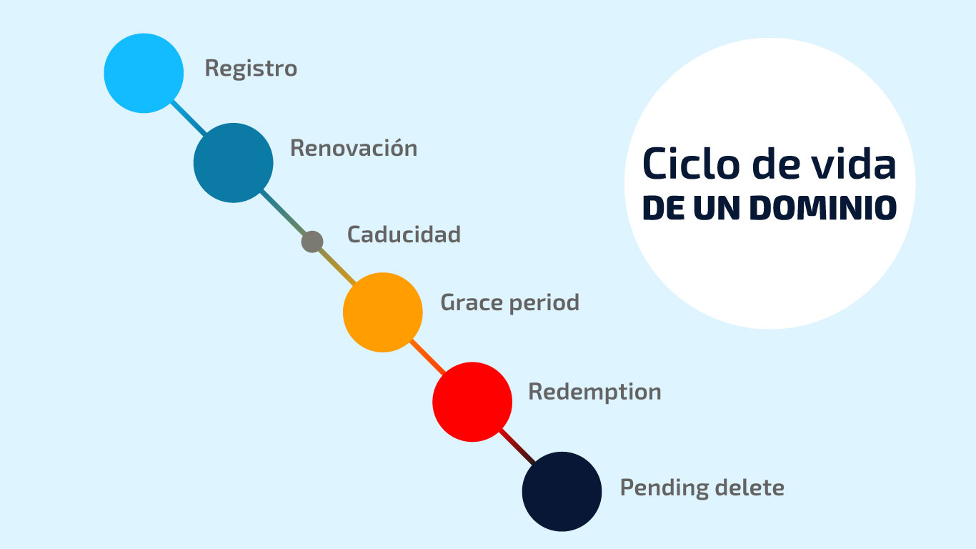 El siguiente gráfico representa el ciclo de vida de un dominio, mostrando los diferentes estados por los que puede pasar desde que se encuentra disponible hasta que se libera y queda nuevamente habilitado para ser registrado por cualquier persona.