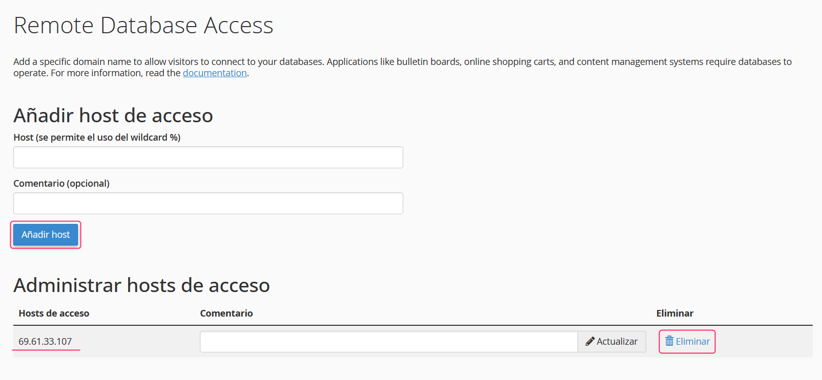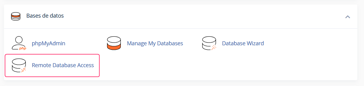 2. En la pantalla de accesos remotos a la base de datos encontrarás estas opciones:\