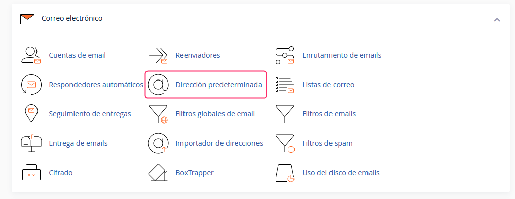4. Ya en el panel de control **cPanel** ingresá a **Dirección Predeterminada**, en el cuadro **Correo electrónico**.