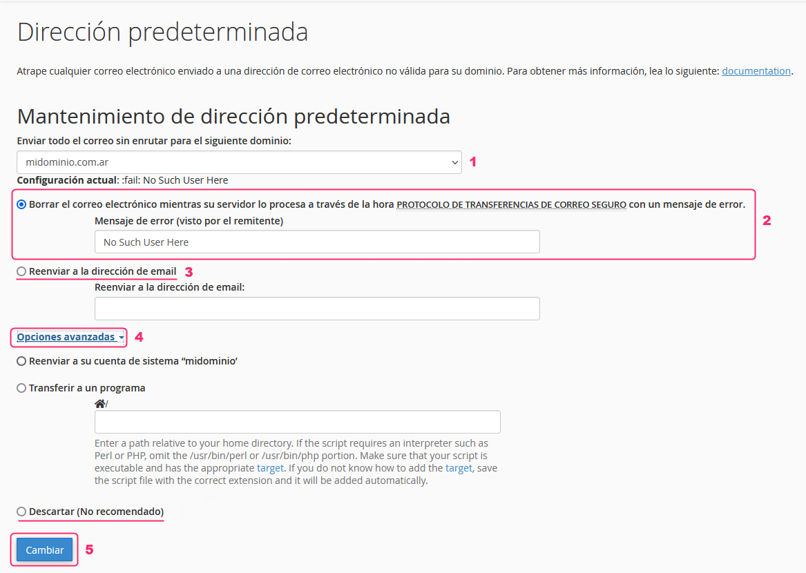En la pantalla de configuración de la casilla predeterminada podrás elegir distintas opciones para redirigir los emails recibidos a casillas inexistentes.