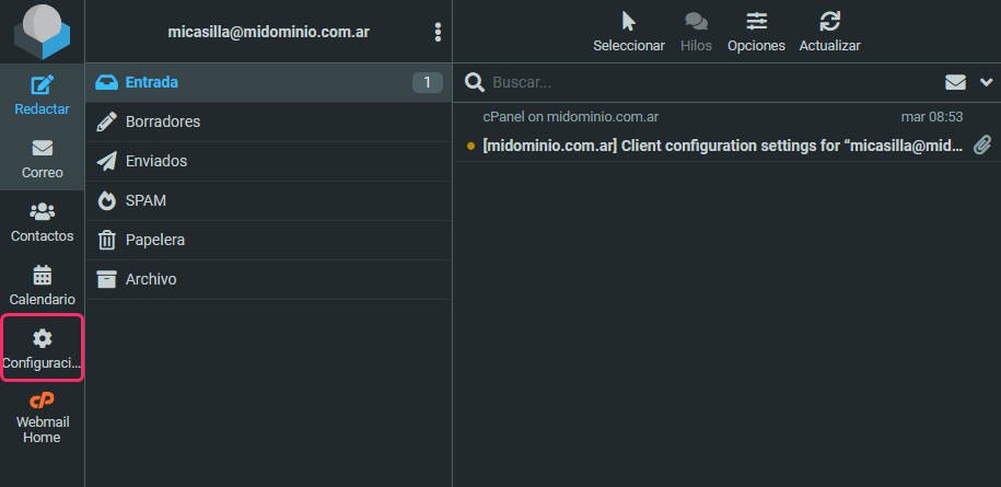 7. Al ingresar al Webmail presioná el botón **Configuración** en el menú de la izquierda.