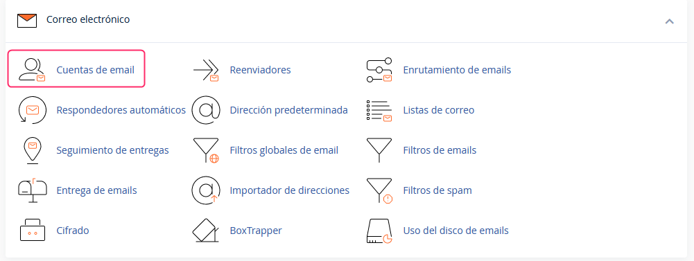 4. Ya en el panel de control **cPanel** ingresá a **Cuentas de email**, en el cuadro **Correo electrónico**.