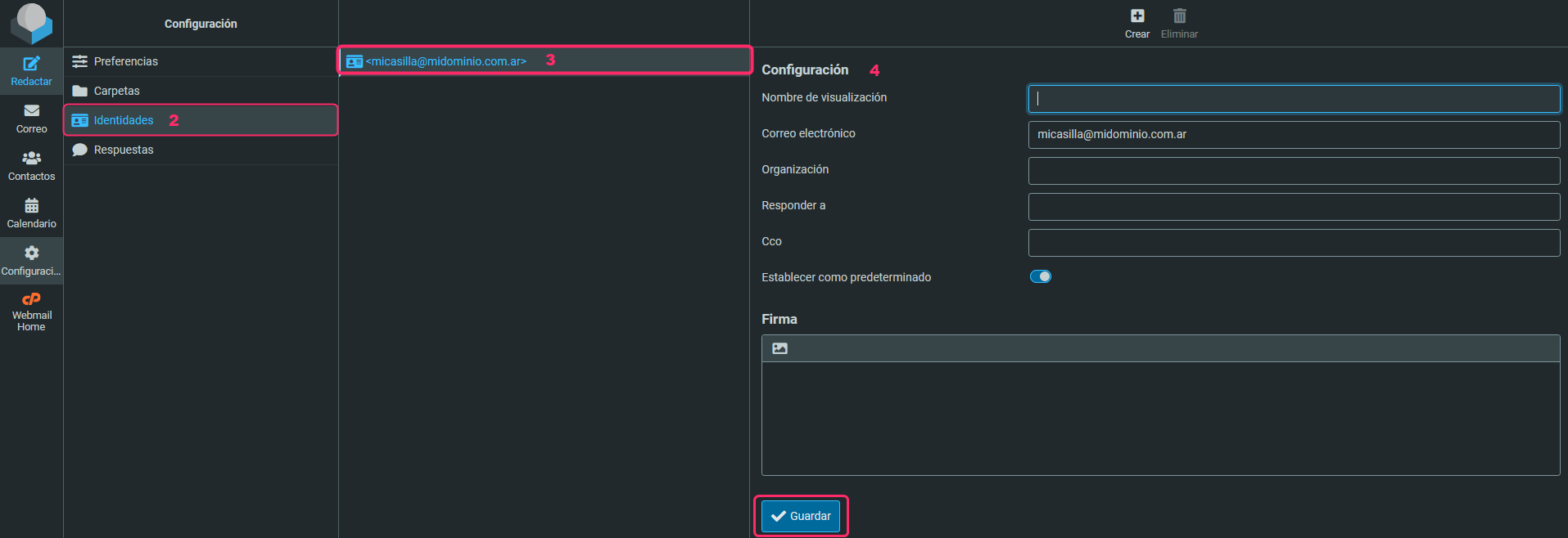 8. Luego, hacé clic en **Identidades** y seleccioná la casilla a la que quieras crearle una **Firma.** Aparecerá el formulario para crear su **Firma**. Al terminar de crearla, grabá con el botón **Guardar**.