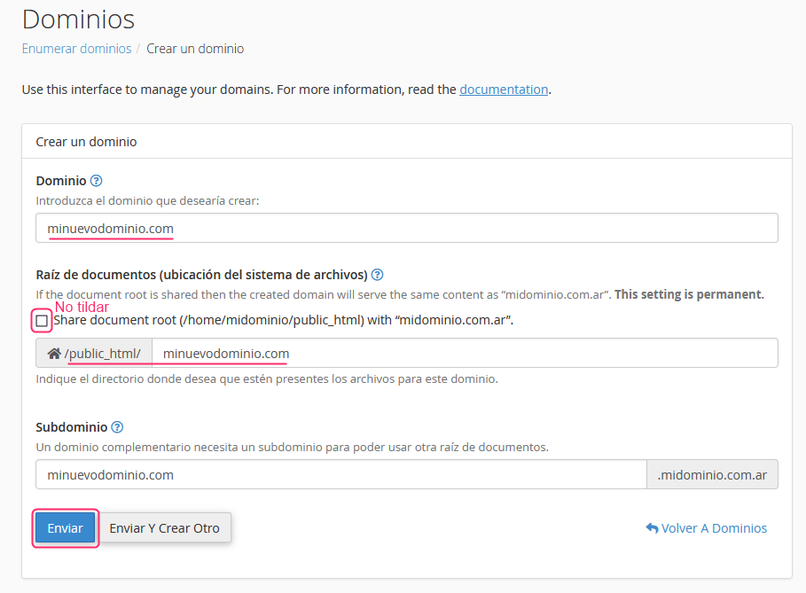Para crear un **Dominio Adicional,** deberás escribir el nombre del nuevo dominio y desactivar la opción **Share document root.** De esta forma, el nuevo dominio creará un directorio donde luego se tendrán que subir los archivos de su sitio web.