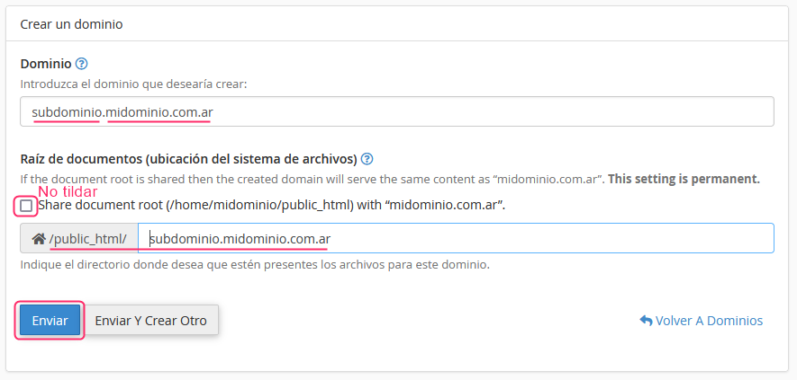 Para crear un **Subdominio** tendrás que escribir el nombre del subdominio asegurándote de completar con el dominio principal deseado. No debés activar la casilla **Share document root.**