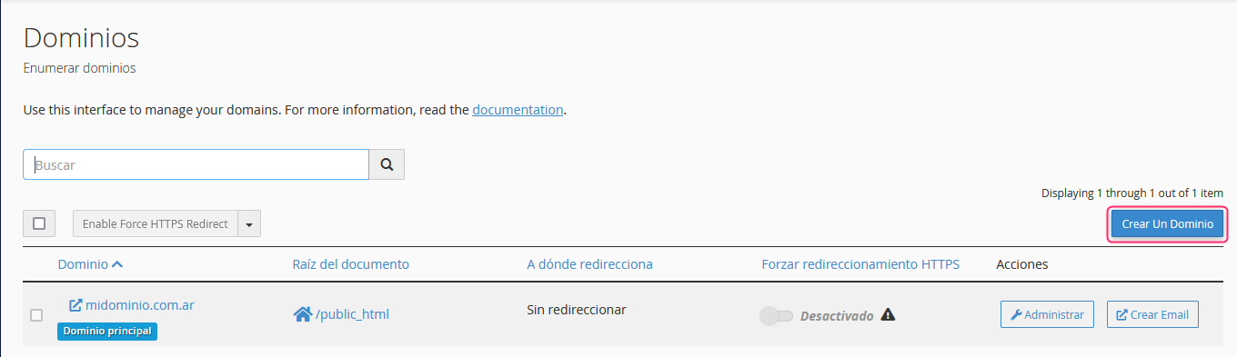 2. En la pantalla de Dominios verás la lista de subdominios, aliases o dominios adicionales que tengas creados. Arriba, a la derecha, encontrarás el botón **Crear Un Dominio**, para crearlos.