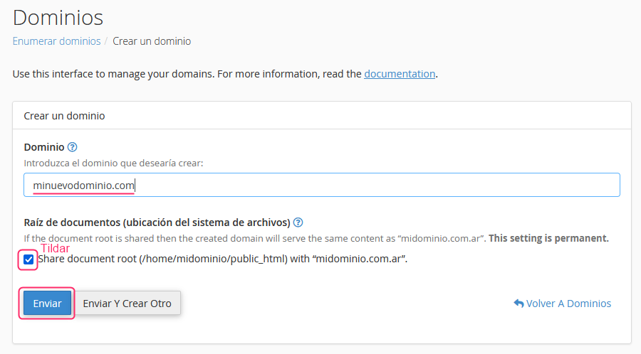 3. En la nueva pantalla podrás crear un subdominio, un alias o un dominio adicional. El tipo de dominio, apuntado (alias/parked) o adicional (addon), se determinará según lo que escribas en el cuadro **Dominio** y si tildás o no la opción **Share document root**.
