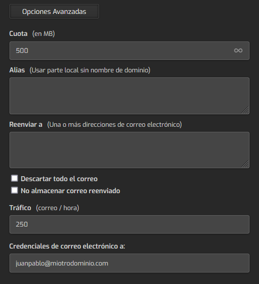 1. En la primer opción podrás definir el espacio máximo que podrá ocupar la casilla de correo.