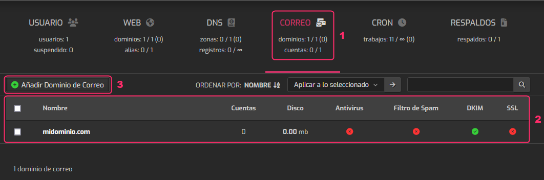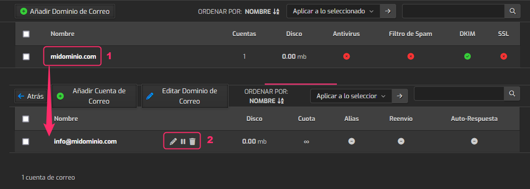 2. Deberías ver un dominio en la lista, con la cantidad de casillas creadas y su información particular.