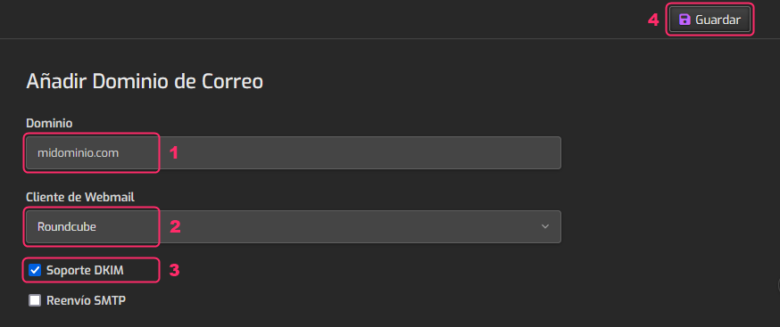 3. Activá la opción **Soporte DKIM** para tener una autenticación de mails que cumpla las políticas antispam.