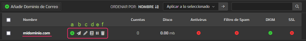 f - Podrás borrar el dominio con esta opción. Esto borrará todas las casillas de correo asociadas.&#x20;