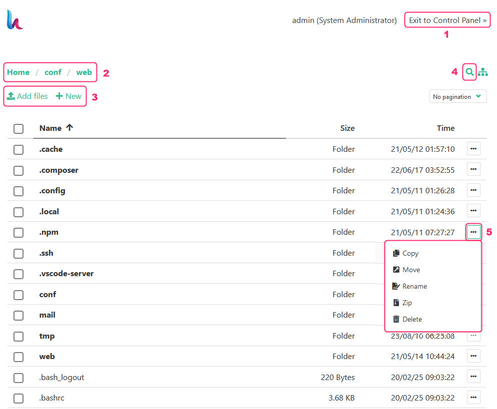 5. Cada archivo o directorio tendrá un menú desplegable desde donde podrás hacer diferentes acciones con el elemento seleccionado (copiar, mover, renombrar, borrar, etc.).