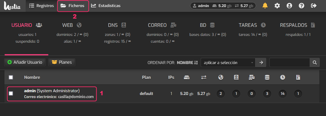 Para ingresar al **Administrador de Archivos** tendrás que elegir una cuenta de hosting, desde **USUARIO**, y luego ingresar a **Ficheros**, en el menú superior.
