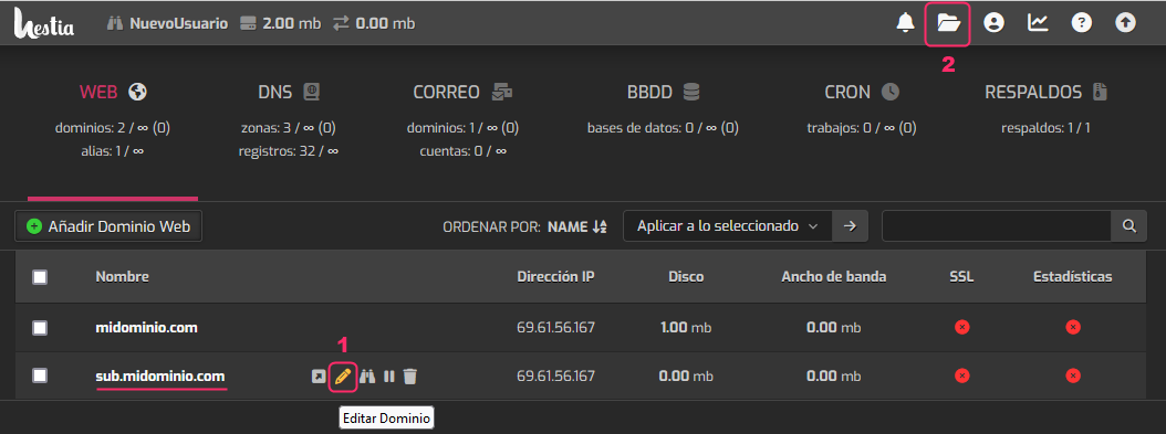 1. Podrás editar el subdominio con el **icono del lápiz**, por ejemplo, para activarle el **certificado SSL**. &#x20;