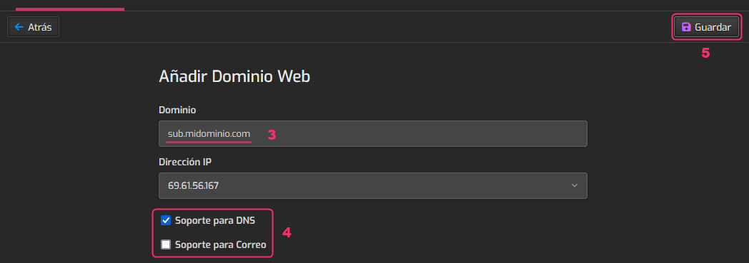 5. Por ultimo, grabá el nuevo subdominio presionando **Guardar**.