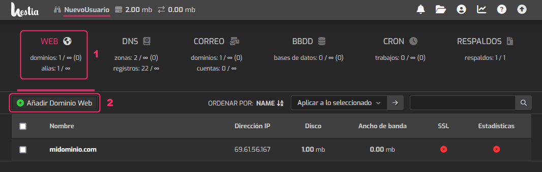 Volviendo a la pantalla principal de cuenta, dentro del área **WEB**, verás el nuevo subdominio.