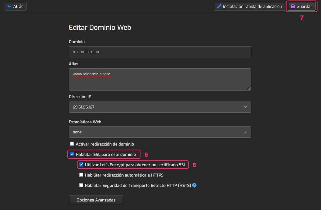 Luego, debes activar Utilizar Let's Encrypt para obtener un certificado SSL.