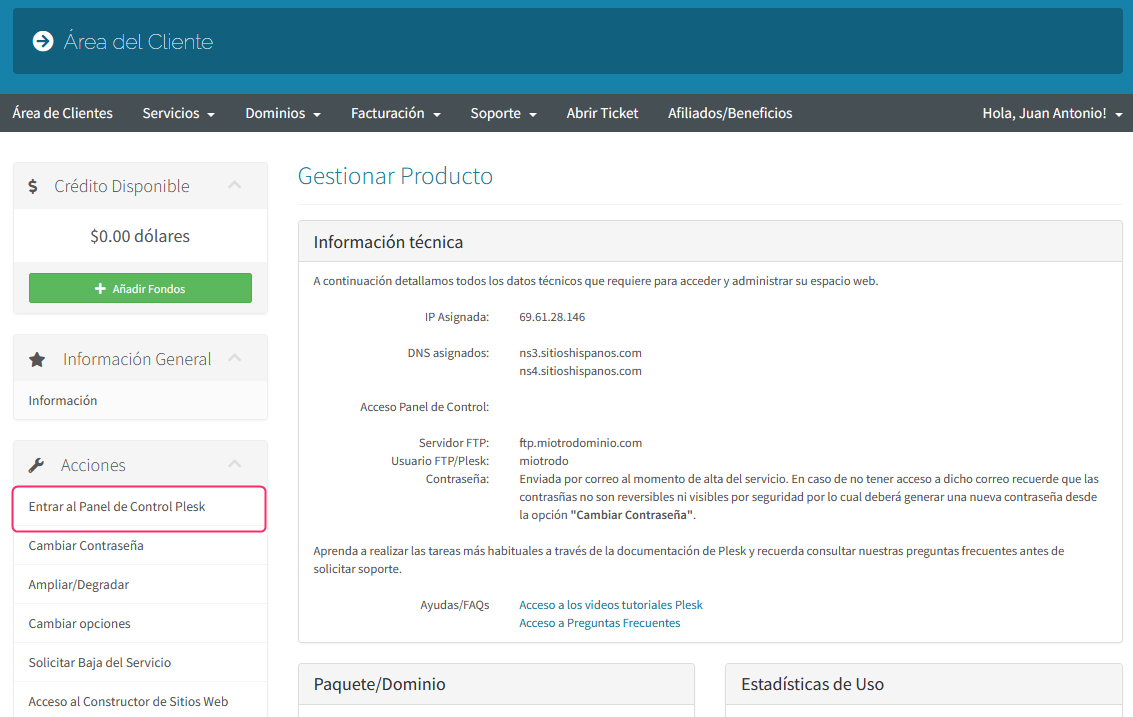 3. En la nueva pantalla verás, en el cuadro **Acciones** de la izquierda, la opción para ingresar al panel de control **Plesk**.